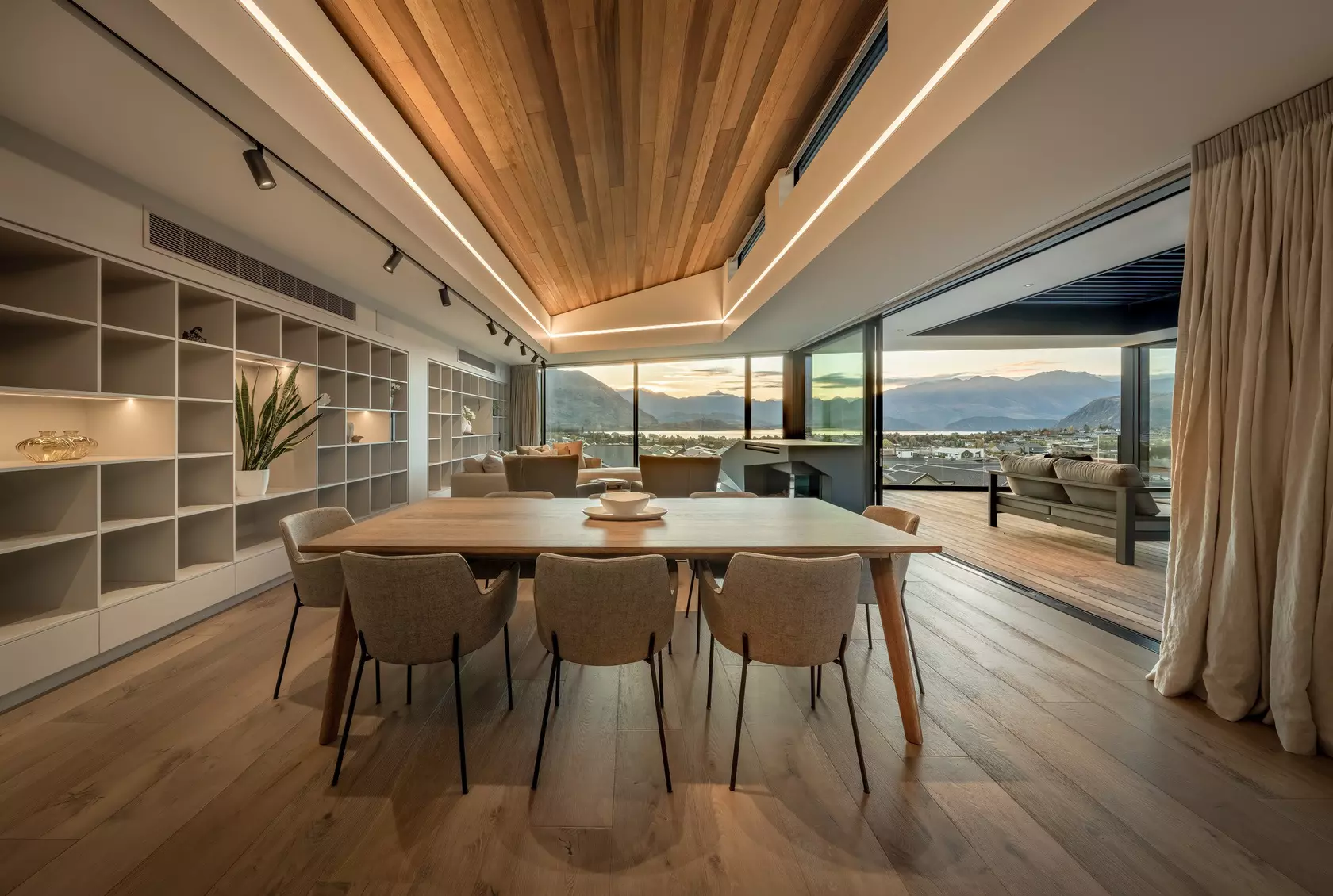 This vision has been achieved by the form’s H-shaped design which offers outdoor living spaces on both sides of the upper level, allowing homeowners to enjoy the Wanaka environment regardless of weather conditions or seasons.